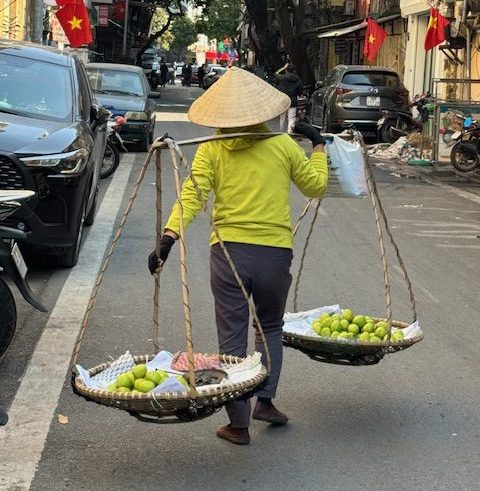 Llegué anoche a la bulliciosa Hanoi y me alojé en el casco antiguo. Esta mañana salí a explorar y me topé con escenas que parecían sacadas de un cuadro: bicis y carritos cargados de mercancías, y el típico palo con dos cestos colgado (yoke o đòn gánh), con la señora de su sombrero cónico equilibrando todo con destreza. Definitivamente, una escena muy “vietnamita”.