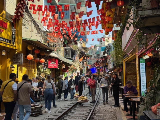 Mi primera parada “oficial” fue la calle del tren (Train Street). Entre las vías se alinean cafeterías coloridas; me encantó y me pareció vibrante.