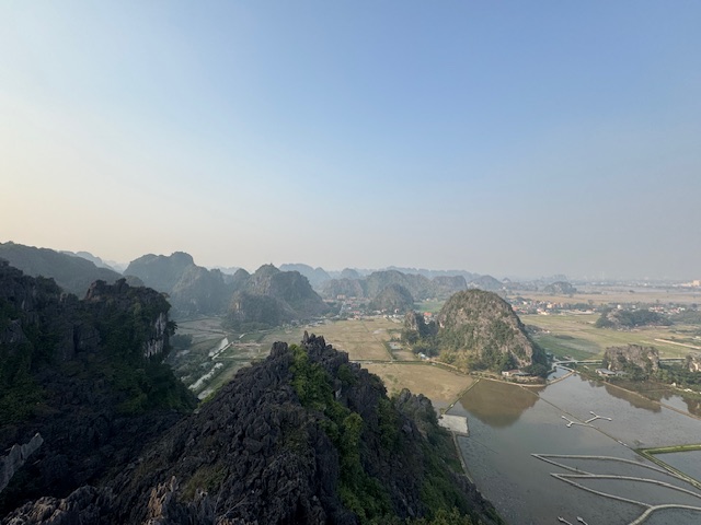 Como última actividad del día, visitamos una zona de campos de arroz ya cosechados, desde donde se puede subir a dos montañas a través de interminables escalones: la Montaña del Dragón Dormido (The Lying Dragon) y la de la Pagoda. Desde Hang Múa podemos admirar el río por el que hemos navegado; las vistas desde lo alto son espectaculares.
